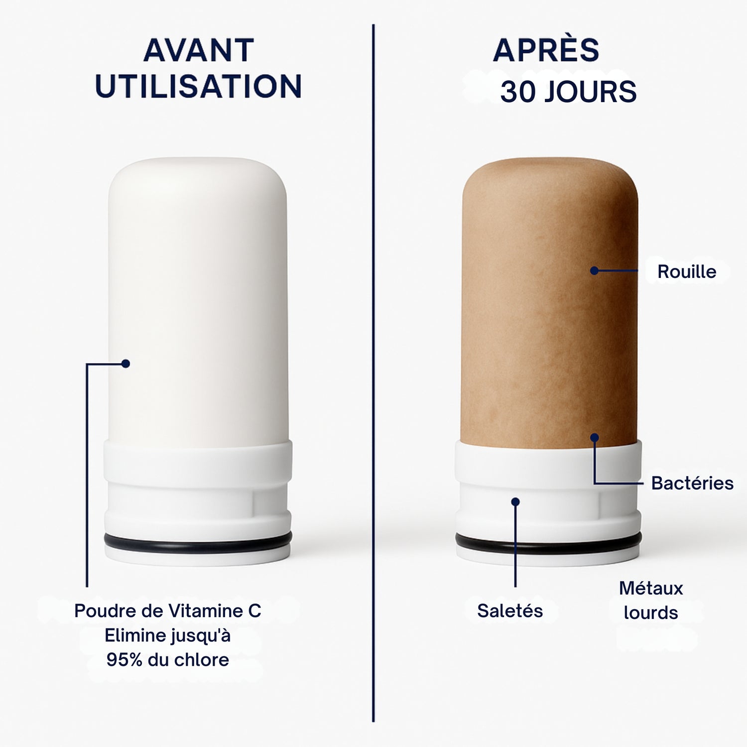 Nos filtres éliminent le chlore, la rouille, les métaux lourds et les bactéries invisibles qui irritent la peau.